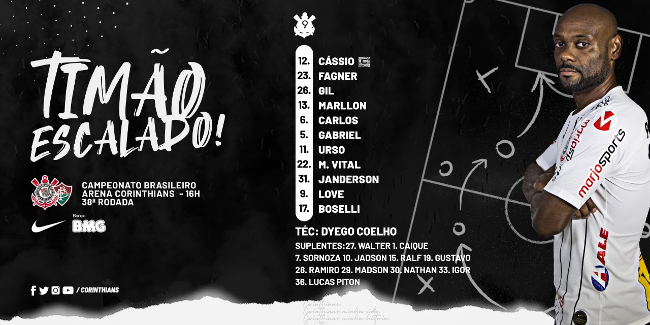 Por meio de suas redes sociais, o Corinthians acaba de divulgar a sua escalação para a partida contra o Fluminense, pela 38ª rodada do Campeonato Brasileiro. Confira abaixo: