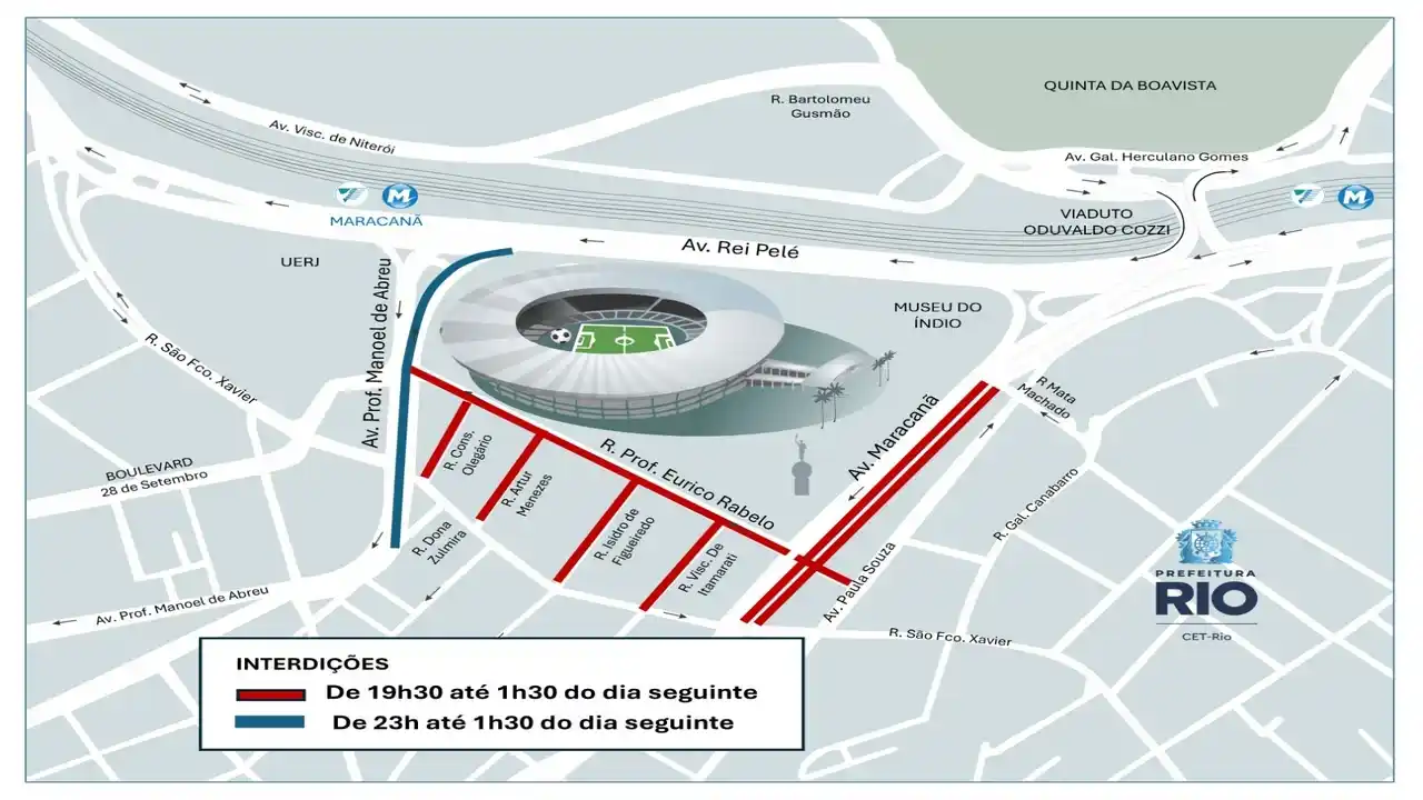 CET-Rio anuncia interdições e proibição de estacionamento no entorno do Maracanã para o jogo desta quarta-feira.
