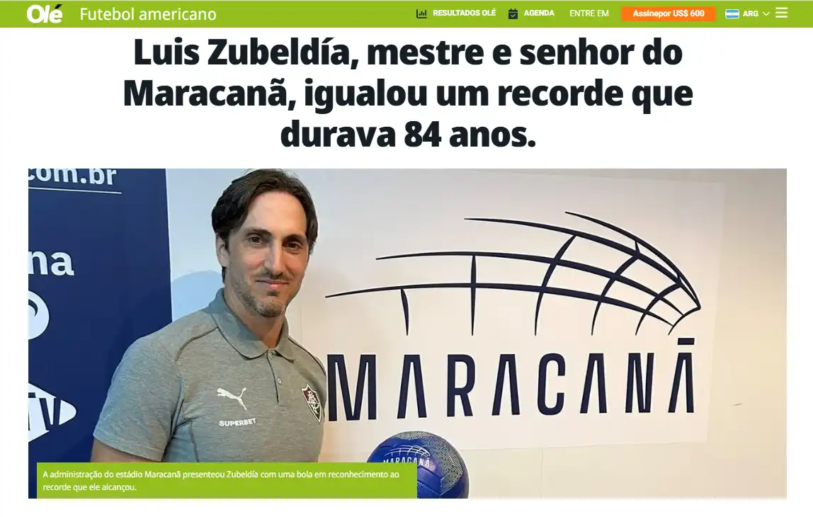 A marca alcançada pelo treinador argentino não passou despercebida em sua terra natal. O tradicional Diário Olé, da Argentina, dedicou espaço para exaltar a campanha do Fluminense. Com o título enfático de que Zubeldía é o “mestre e senhor do Maracanã”, o jornal destacou a força do Time de Guerreiros jogando em seus domínios.