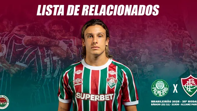 Por intermédio de sua assessoria de imprensa, o Fluminense Football Club informou a lista de relacionados para o jogo contra o Palmeiras, neste sábado (22/11), às 21h30 (de Brasília), no Allianz Parque, em São Paulo, pela 35ª rodada do Brasileirão 2025. Confira a lista completa: